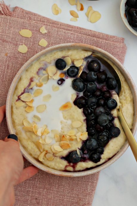 6. Servite il budino irrorato con la salsa di mirtilli rossi, una cucchiaiata di latte di cocco e una manciata di mandorle in scaglie leggermente tostate.